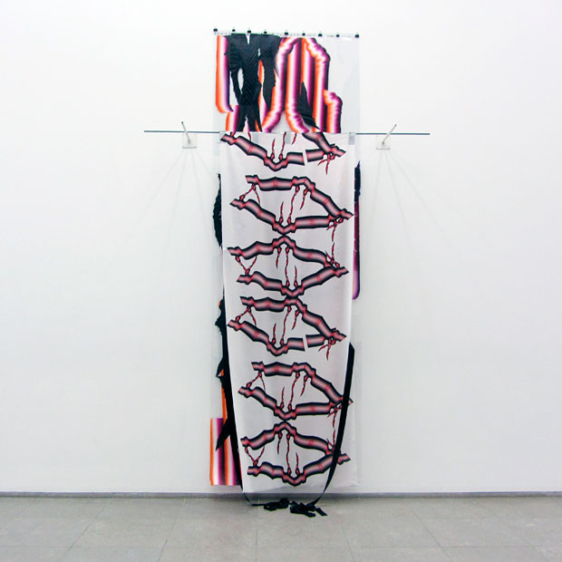 Oil on mylar and digitally printed silk fabrics with ribbon